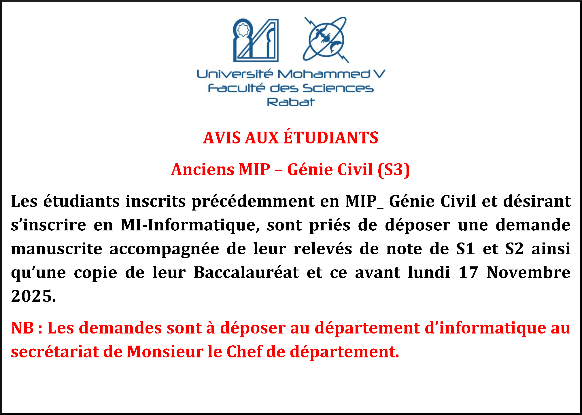 Les étudiants inscrits précédemment en MIP_ Génie Civil et désirant s’inscrire en MI-Informatique, sont priés de déposer une demande manuscrite...