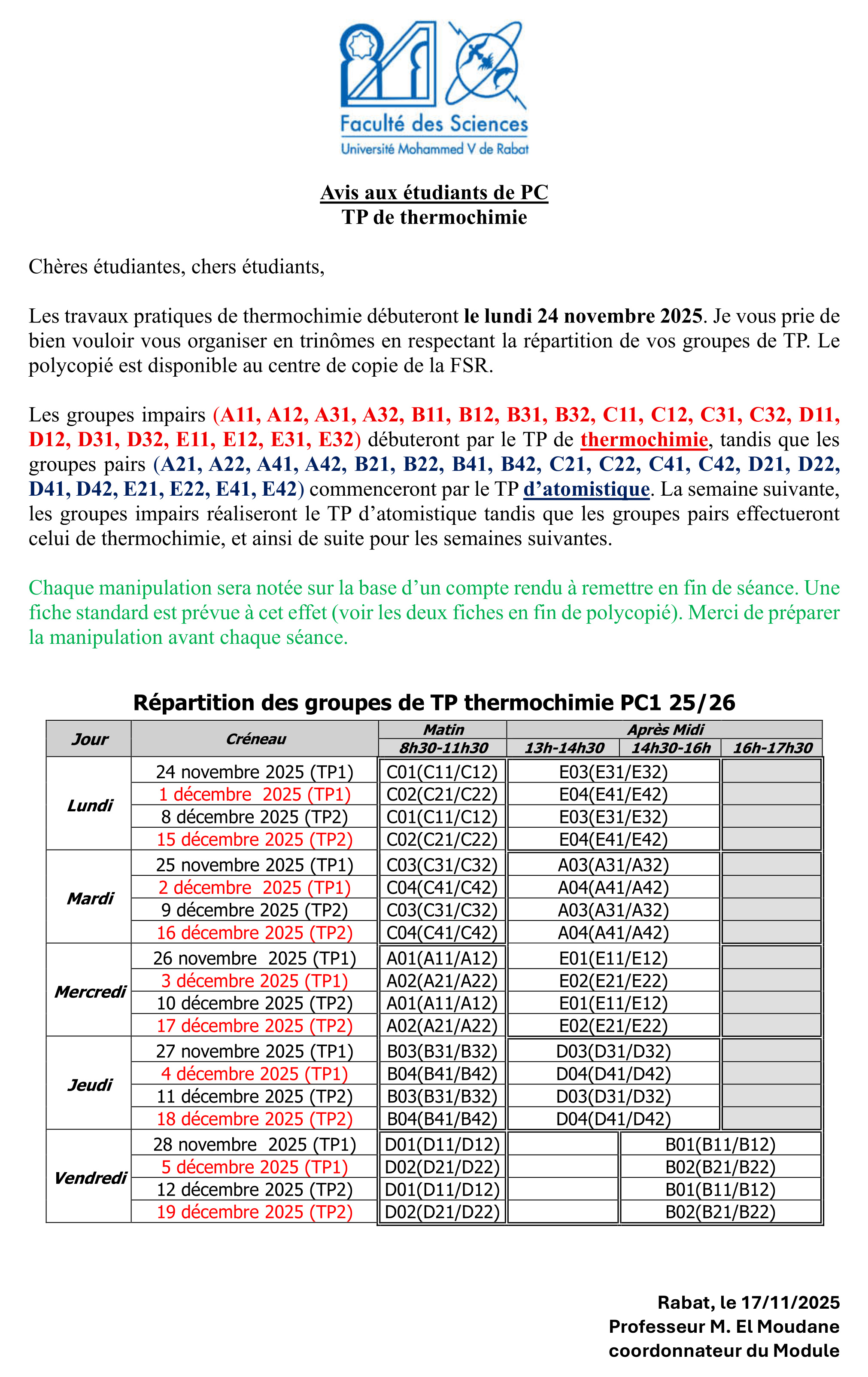 Les travaux pratiques de thermochimie débuteront le lundi 24 novembre 2025. Je vous prie de bien vouloir vous organiser en trinômes en respectant la répartition de vos groupes de TP.....
