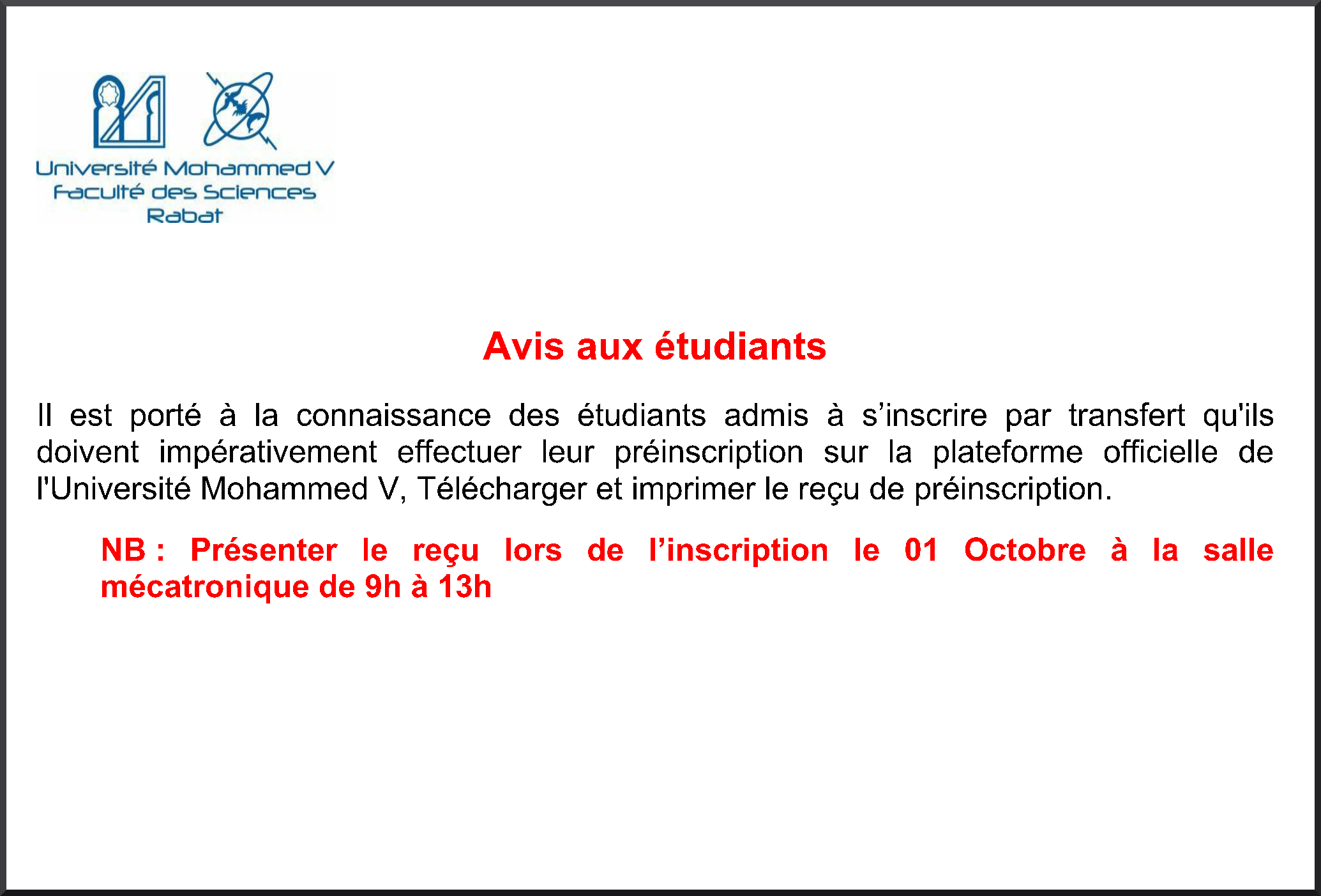 Il est porté à la connaissance des étudiants admis à s’inscrire par transfert qu'ils doivent impérativement effectuer leur préinscription sur la plateforme officielle de l'Université Mohammed V, Télécharger et imprimer le reçu de préinscription.