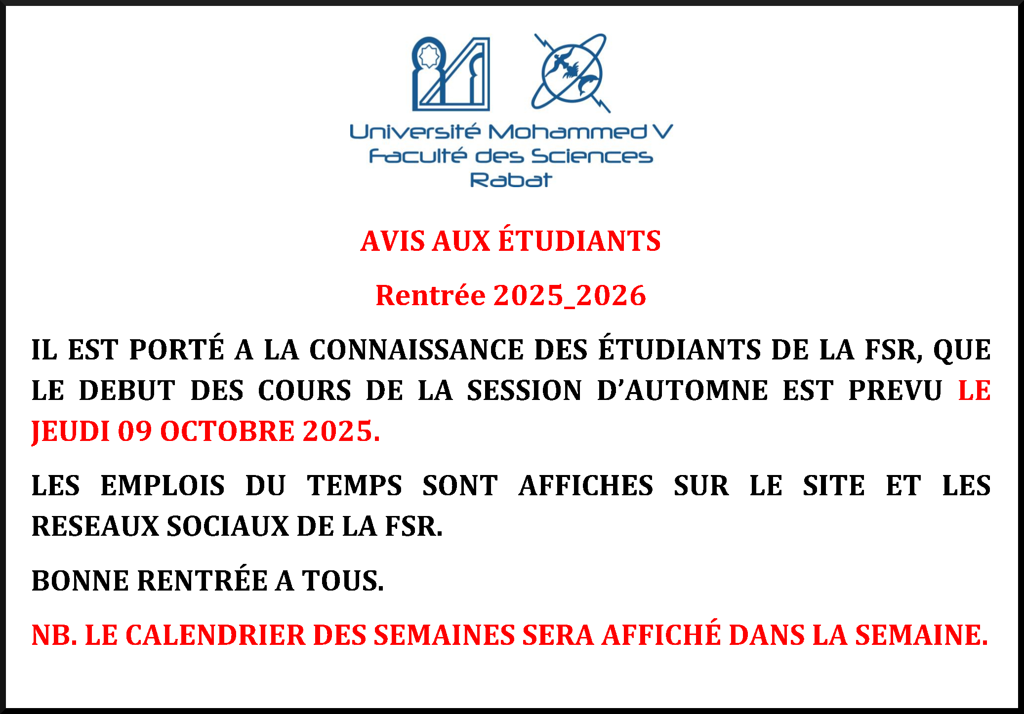 IL EST PORTÉ A LA CONNAISSANCE DES ÉTUDIANTS DE LA FSR, QUE LE DEBUT DES COURS DE LA SESSION D’AUTOMNE EST PREVU LE JEUDI 09 OCTOBRE 2025.