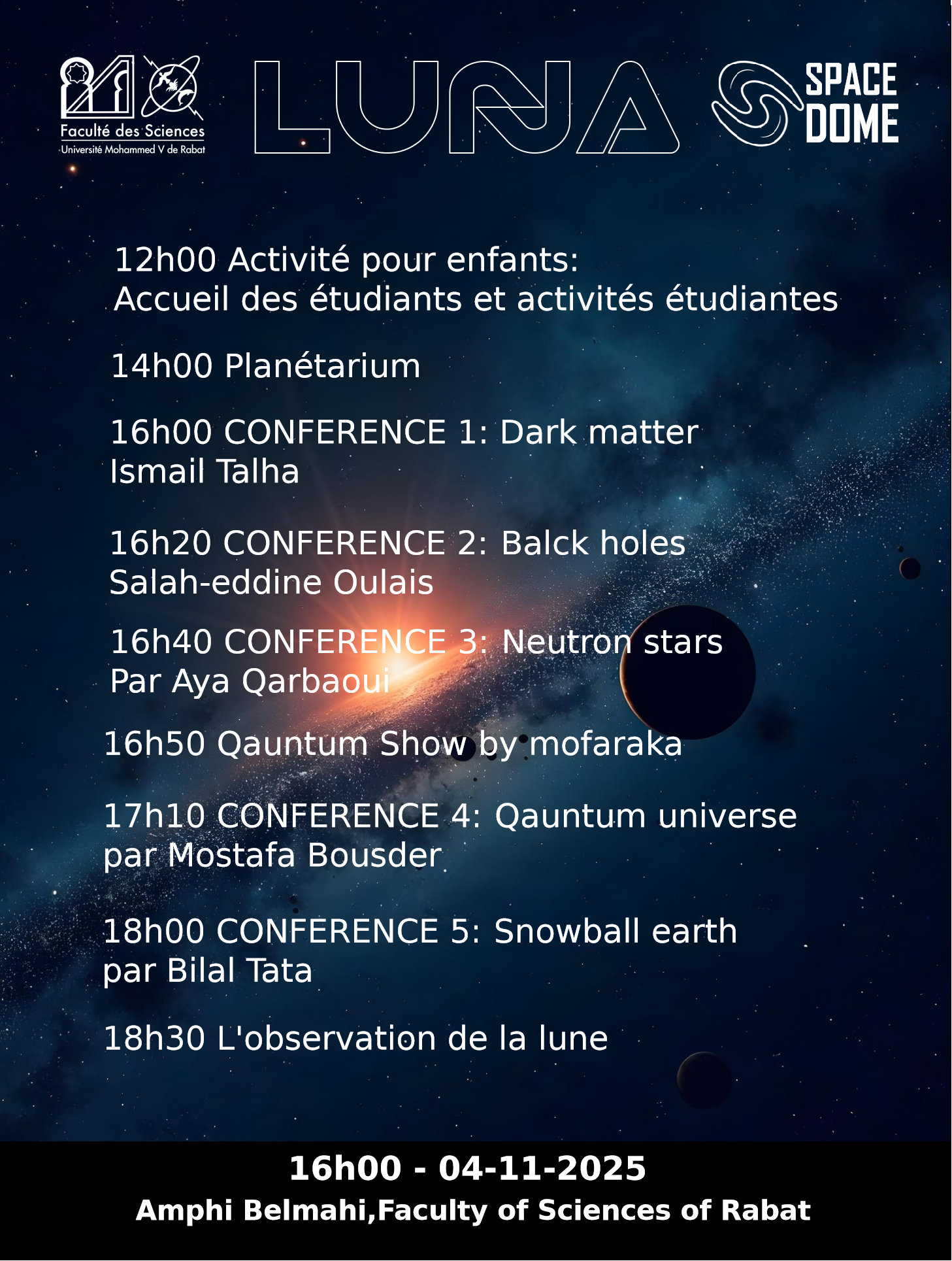 Le DOM de la Faculté des Sciences de Rabat organise une journée d’astronomie, le mardi 4 novembre 2025 à partir de 16h....