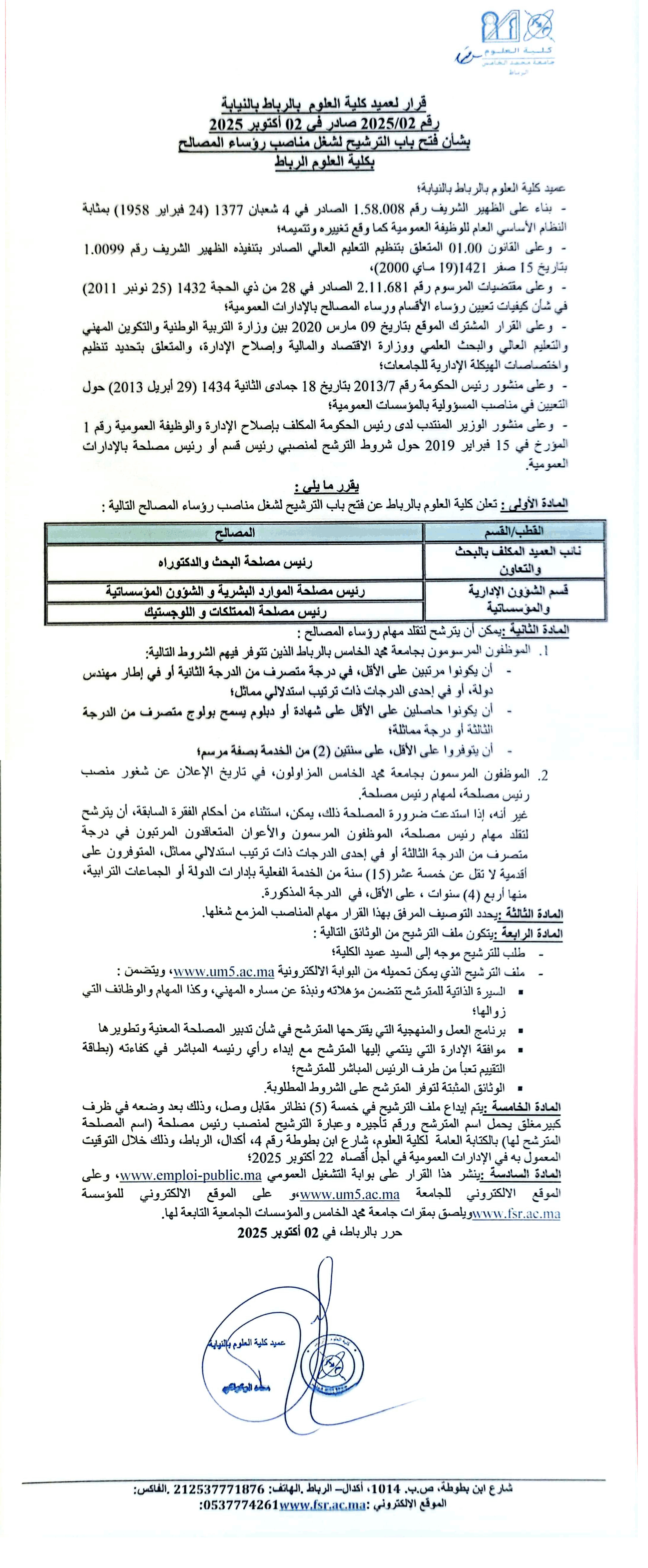 La Faculté des Sciences de Rabat annonce l’ouverture des candidatures pour occuper les postes de chefs de services (Dossier de candidature).