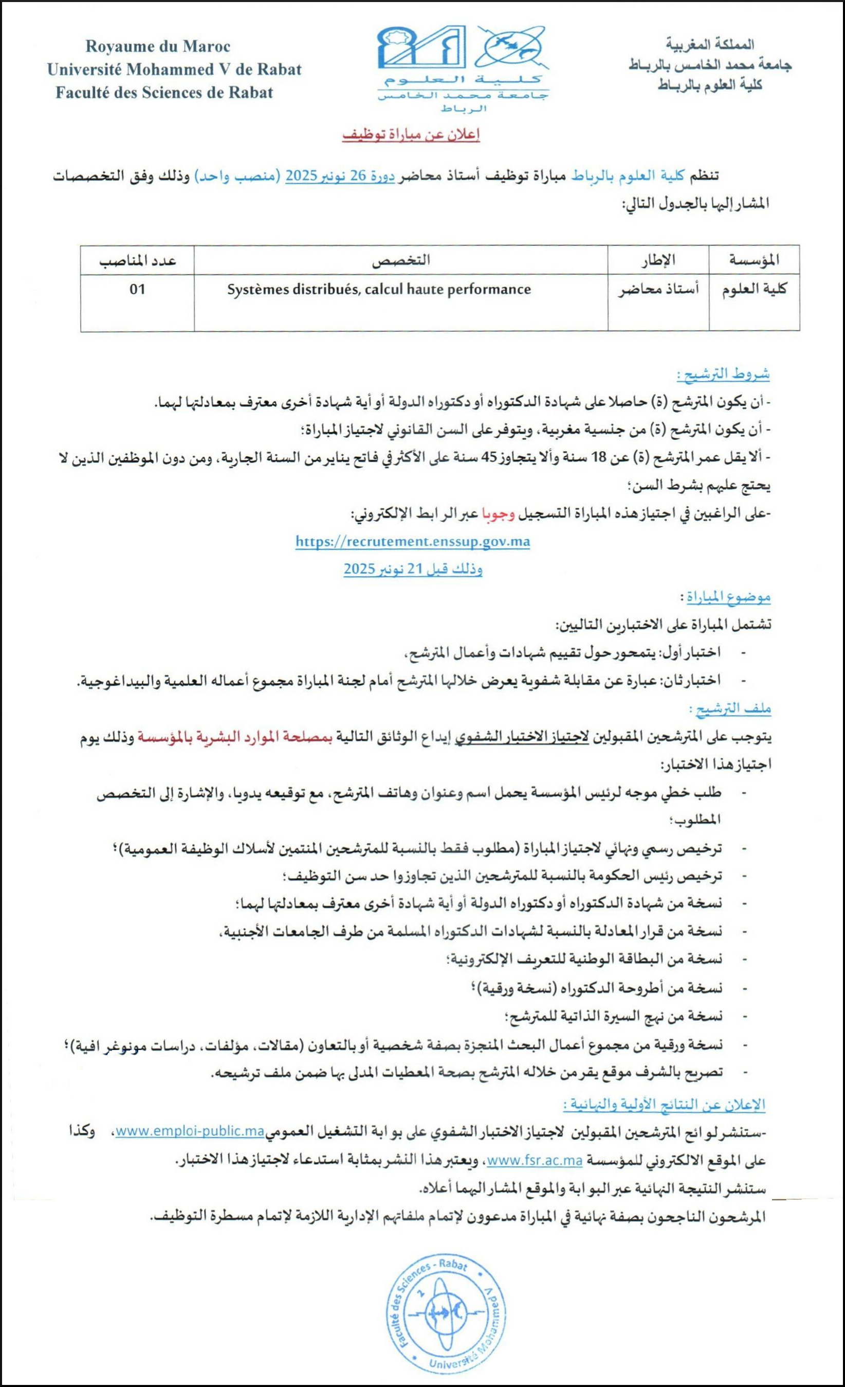 La Faculté des Sciences de Rabat organise un concours de recrutement de maitre de conférences session du 26 novembre 2025....