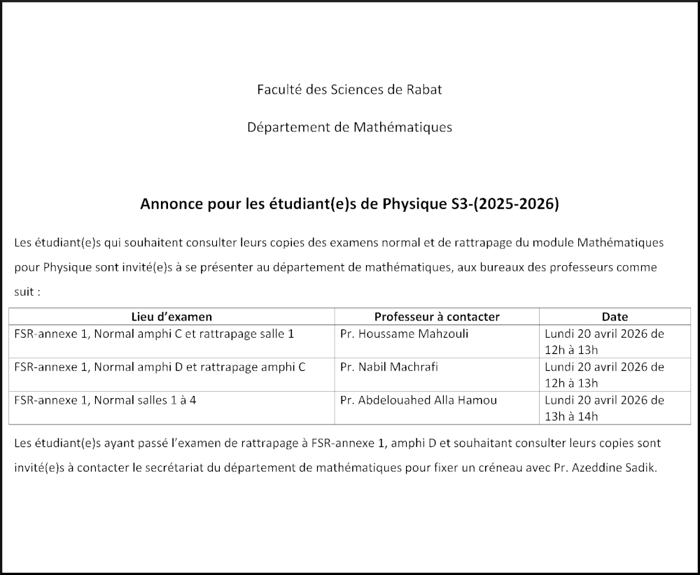 Les étudiant(e)s qui souhaitent consulter leurs copies des examens normal et de rattrapage du module Mathématiques pour Physique sont invité(e)s à se présenter au département de mathématiques, aux bureaux des professeurs comme..
